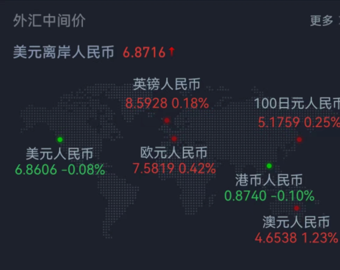 周五在岸人民幣兌美元16:30收盤(pán)報(bào)6.8495,較上一交易日漲226個(gè)基點(diǎn),周漲259個(gè)基點(diǎn)。人民幣兌美元中間價(jià)報(bào)6.8606,調(diào)升52個(gè)基點(diǎn),本周累計(jì)調(diào)升232個(gè)基點(diǎn)。在岸人民幣兌美元夜盤(pán)收?qǐng)?bào)6.8690。