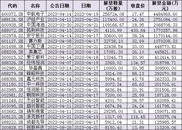 與此同時(shí),統(tǒng)計(jì)顯示,下周(4月17日—21日)共有54家公司限售股陸續(xù)解禁,按最新收盤(pán)價(jià)計(jì)算,解禁市值為1779.43億元。從解禁市值來(lái)看,中航電子(448.5億元)、滬硅產(chǎn)業(yè)(275.11億元)、中國(guó)海油(206.87億元)、拓荊科技-U(177.01億元)、安寧股份(117.01億元)、賽力斯(107.02億元)等公司解禁金額均超100億元。