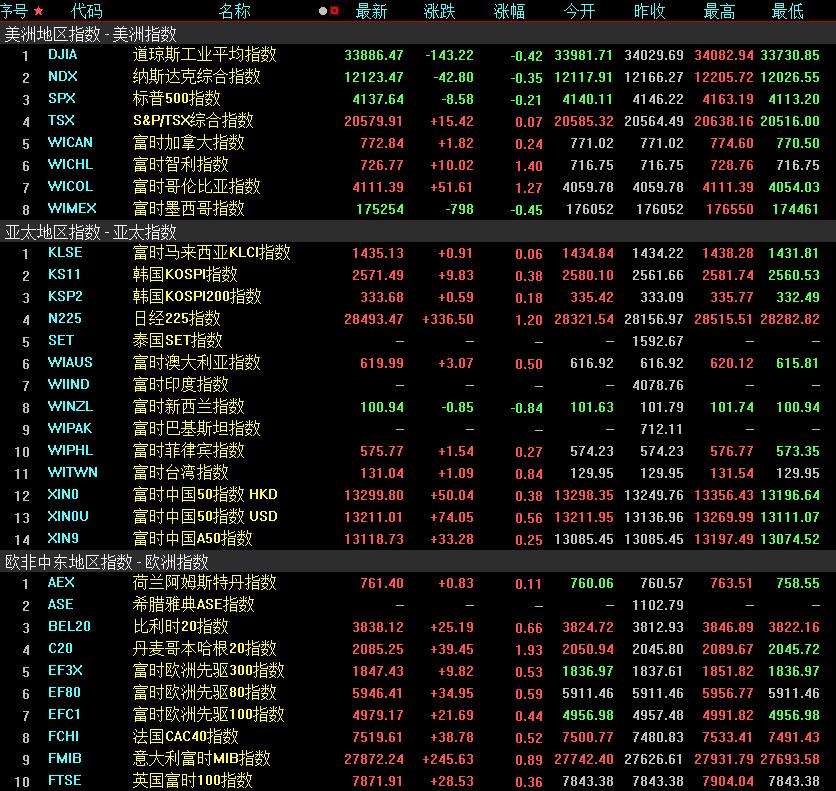 周五,美國(guó)三大股指全線(xiàn)收跌,道指跌0.42%報(bào)33886.47點(diǎn),標(biāo)普500指數(shù)跌0.21%報(bào)4137.64點(diǎn),納指跌0.35%報(bào)12123.47點(diǎn)。本周,道指漲1.2%,標(biāo)普500指數(shù)漲0.79%,納指漲0.29%。