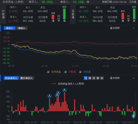 4月24日,繼上周五大跌后,今日A股繼續(xù)調(diào)整,滬指失守3300點整數(shù)關(guān)口,深證成指和創(chuàng)業(yè)板指的表現(xiàn)相對較弱。截至收盤,上證指數(shù)跌0.78%報3275.41點;深證成指跌1.17%報11317.01點,創(chuàng)業(yè)板指跌1.71%報2301.24點,A股合計成交額10844.24億元,較前一交易日縮減11.01%,北向資金凈賣出38.28億元,滬股通凈買入2.08億元,深股通凈買入-40.36億元。總體上看,A股中漲少跌多,有2047只上漲,2940只下跌。