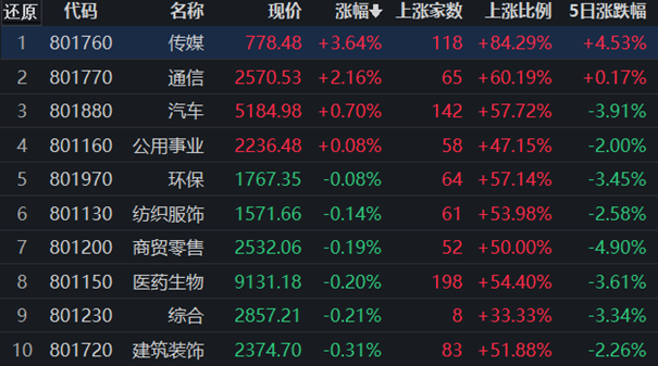 漲停股方面,今日有40只個股以漲停價報收,其中,有13只個股,股價已連續(xù)上漲超過3個交易日;跌停方面,有53只個股跌停價報收。從申萬一級行業(yè)看,傳媒漲停股數(shù)量居首,為13只,通信和醫(yī)藥生物緊隨其后,漲停股數(shù)分別為6只和4只;房地產(chǎn)跌停股數(shù)量居首,為7只,此外,醫(yī)藥生物跌停股數(shù)達到6只。