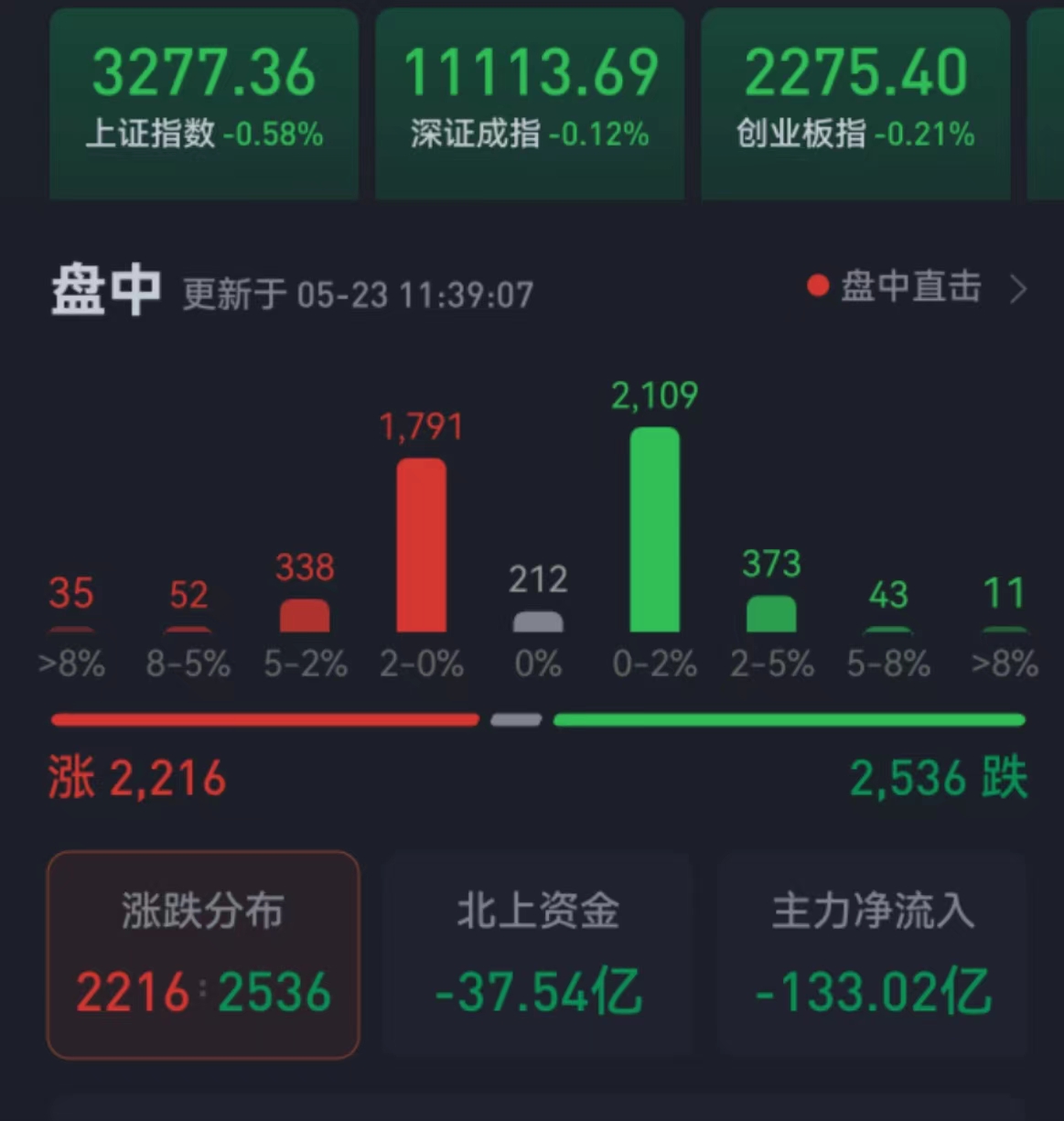 周二(5月23日),三大股指震蕩回落。截至上午收盤(pán),上證指數(shù)跌幅達(dá)0.58%,報(bào)3277.36點(diǎn);深證成指跌幅達(dá)0.12%,創(chuàng)業(yè)板指漲幅為0.21%;滬深兩市合計(jì)成交額4782億元,總體來(lái)看,兩市個(gè)股跌多漲少。