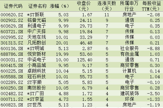 表:連續(xù)上漲4日且今日收盤漲停股一覽