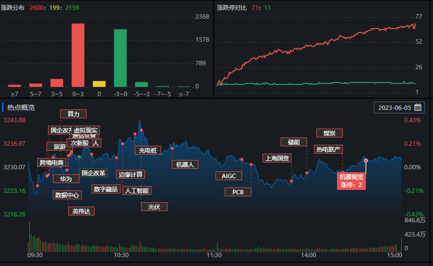6月5日,滬指小幅高開,午后圍繞平盤線窄幅整理,深證成指、創(chuàng)業(yè)板指低開低走,今日兩市呈滬強(qiáng)深弱格局。北向資金全天凈賣出12.15億元,其中滬股通凈買入4.85億元,深股通凈賣入17億元。今日A股上漲數(shù)稍多于下跌數(shù),有2608只上漲,2159只下跌。