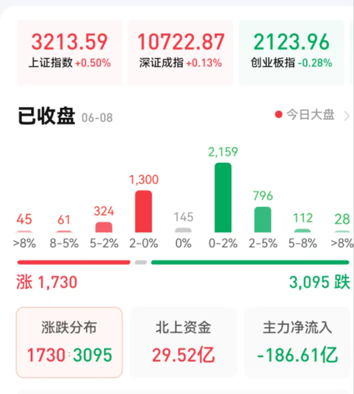 周四(6月8日),A股三大股指震蕩整理,漲跌不一。截至收盤(pán),上證指數(shù)漲0.5%報(bào)3213.59點(diǎn),深證成指漲0.13%報(bào)10722.87點(diǎn),創(chuàng)業(yè)板指跌0.28%報(bào)2123.96點(diǎn);兩市合計(jì)成交8596億元,北向資金凈買(mǎi)入29.52億元??傮w上看,兩市個(gè)股跌多漲少。其中,漲停個(gè)股達(dá)39只,跌停個(gè)股達(dá)18只。