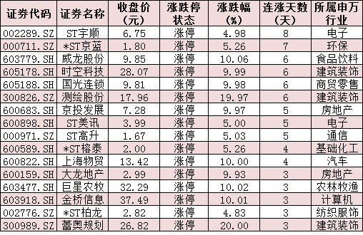 表:連續(xù)3日上漲且今日收盤(pán)漲停個(gè)股情況: