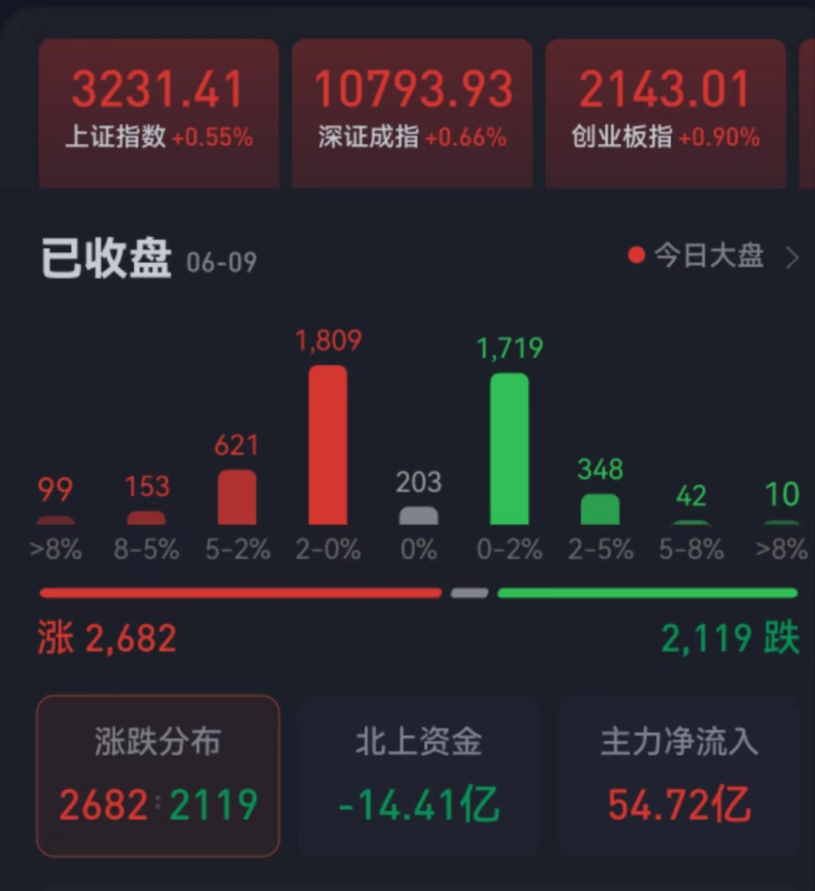 周五(6月9日),A股三大股指震蕩上行,全線飄紅。截至收盤,上證指數(shù)漲0.55%報3231.41點,深證成指漲0.66%報10793.93點,創(chuàng)業(yè)板指漲0.90%報2143.01點;兩市合計成交9896億元,北向資金凈賣出14.41億元。總體上看,兩市個股漲多跌少。其中,漲停個股達74只,跌停個股達11只。