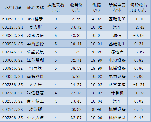 表:連續(xù)上漲4日且今日收盤漲停股一覽