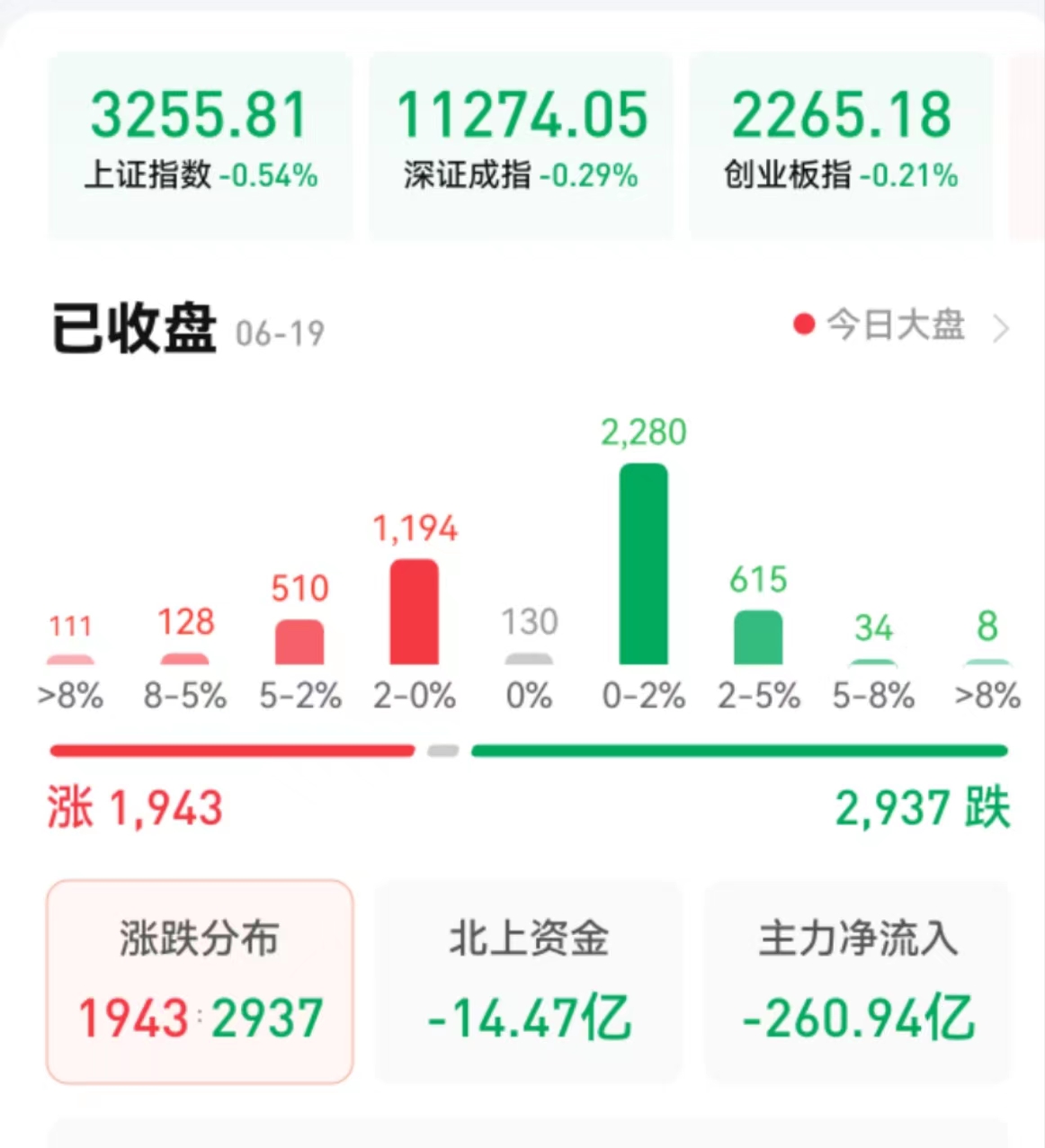 周一(6月19日),A股三大股指震蕩回落。截至收盤,上證指數(shù)跌0.54%報(bào)3255.81點(diǎn),深證成指跌0.29%報(bào)11274.05點(diǎn),創(chuàng)業(yè)板指跌0.21%報(bào)2265.18點(diǎn),兩市合計(jì)成交金額達(dá)11067億元,連續(xù)第4個(gè)交易日突破萬(wàn)億元;北向資金凈賣出14.47億元??傮w上看,兩市個(gè)股跌多漲少。其中,漲停個(gè)股達(dá)54只,跌停個(gè)股達(dá)6只。