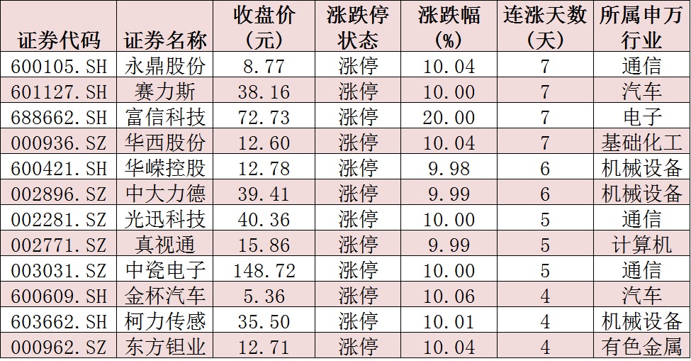 表:連續(xù)上漲4日且今日收盤漲停個(gè)股情況: