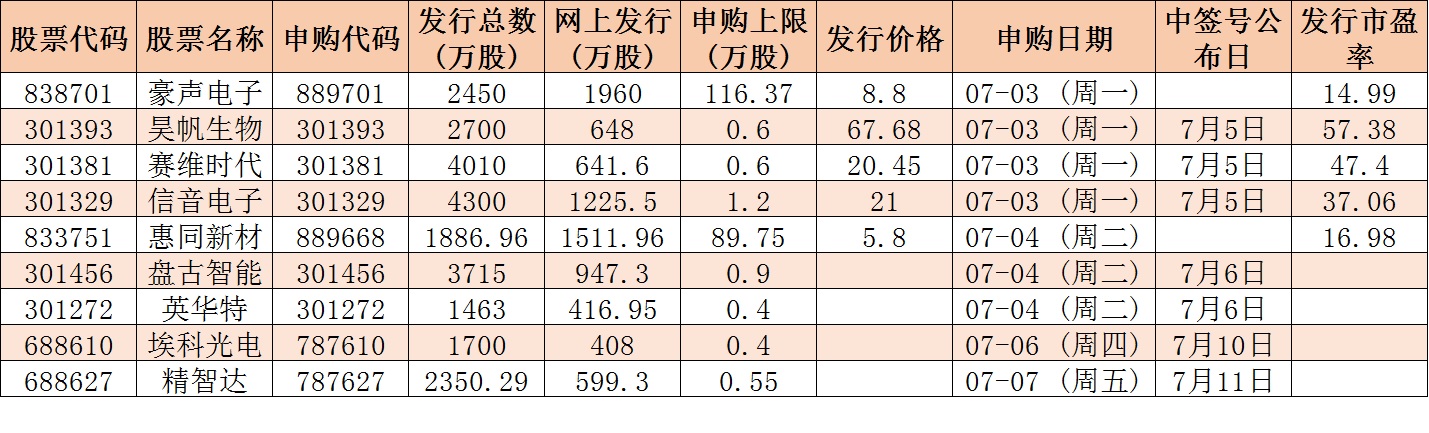 根據(jù)發(fā)行安排,下周(7月3日-7月7日)A股市場共9只新股發(fā)行,其中創(chuàng)業(yè)板5只,科創(chuàng)板2只,北交所2只。