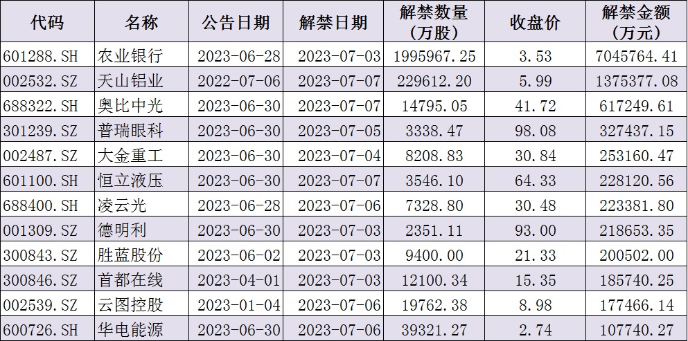 與此同時(shí),據(jù)同花順統(tǒng)計(jì)顯示,下周(7月3日-7日)共有88家公司限售股陸續(xù)解禁,按最新收盤價(jià)計(jì)算,解禁市值為1226.34億元。從解禁市值來看,農(nóng)業(yè)銀行(704.58億元)、天山鋁業(yè)(137.54億元)等公司解禁金額超100億元。