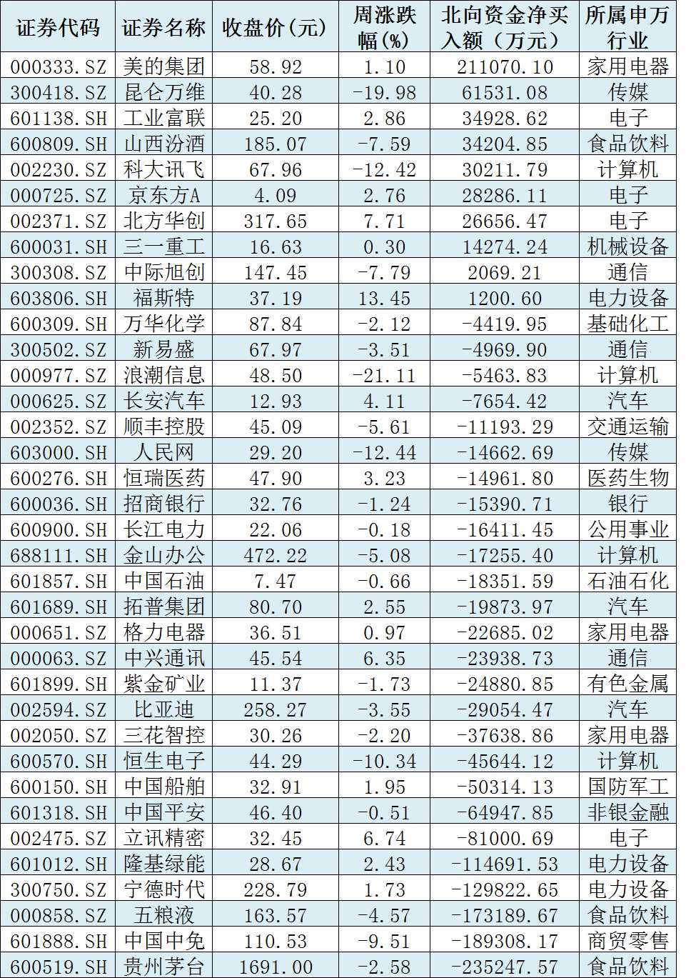 資金方面,本周北向資金累計(jì)凈賣出金額達(dá)84.81億元。從前十大成交活躍股來看,本周,美的集團(tuán)、昆侖萬維等2只個(gè)股,北向資金凈買入金額均超6億元。另外,貴州茅臺(tái)、中國中免、五糧液、寧德時(shí)代、隆基綠能等個(gè)股遭北向資金凈賣出金額均超10億元。