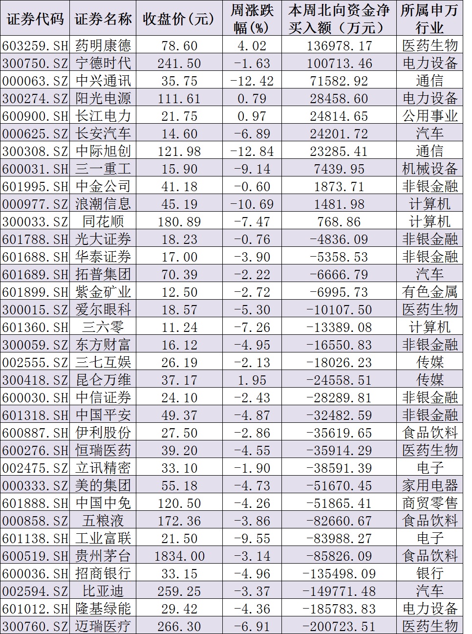 資金方面,本周北向資金累計(jì)凈賣(mài)出金額達(dá)255.8億元。從前十大成交活躍股來(lái)看,本周,藥明康德、寧德時(shí)代等2只個(gè)股,北向資金凈買(mǎi)入金額均超10億元。另外,邁瑞醫(yī)療、隆基綠能、比亞迪、招商銀行等個(gè)股遭北向資金凈賣(mài)出金額均超10億元。