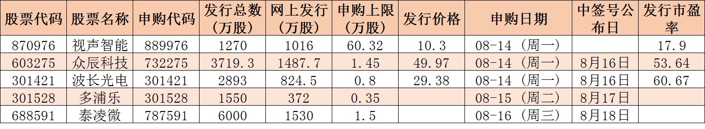 根據(jù)發(fā)行安排,下周(8月14日-18日)有5只新股發(fā)行,包括滬市主板新股1只、科創(chuàng)板新股1只、創(chuàng)業(yè)板新股2只、北交所新股1只。