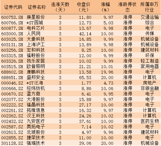 表:連續(xù)上漲3日且今日以漲停價(jià)報(bào)收個(gè)股一覽