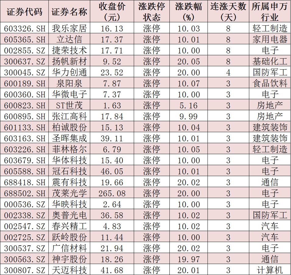 表:連續(xù)上漲3日且今日收盤(pán)漲停個(gè)股情況