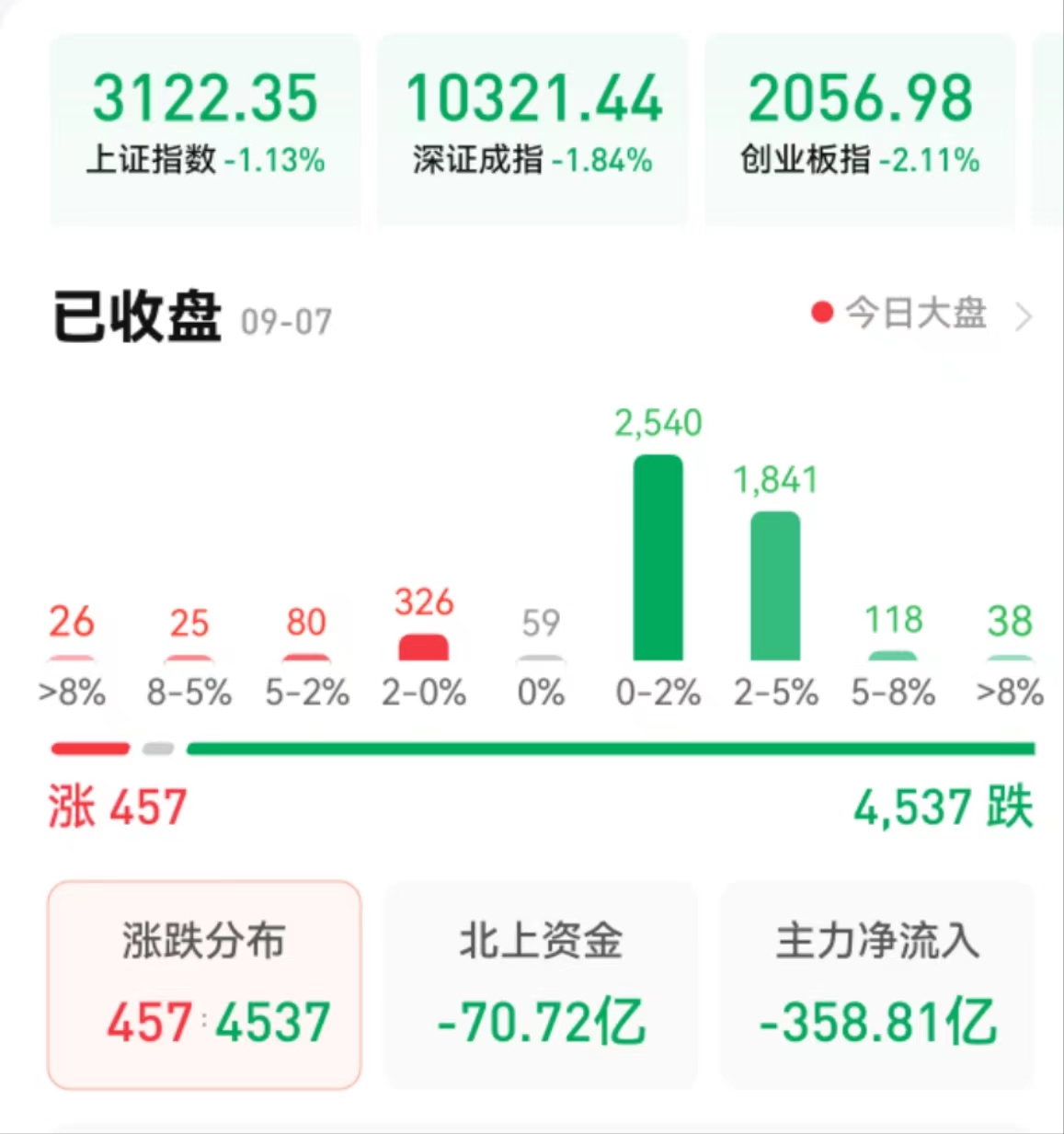 周四(9月7日),A股三大股指震蕩下行,全線飄綠。截至收盤,上證指數(shù)跌1.13%報3122.35點(diǎn),深成指跌1.84%報10321.44點(diǎn),創(chuàng)業(yè)板指跌2.11%報2056.98點(diǎn);兩市合計成交7668.35億元,北向資金凈賣出70.72億元??傮w上看,兩市個股跌多漲少,超4500只個股下跌,上漲個股不到500只。其中,漲停個股達(dá)23只,跌停個股達(dá)4只。