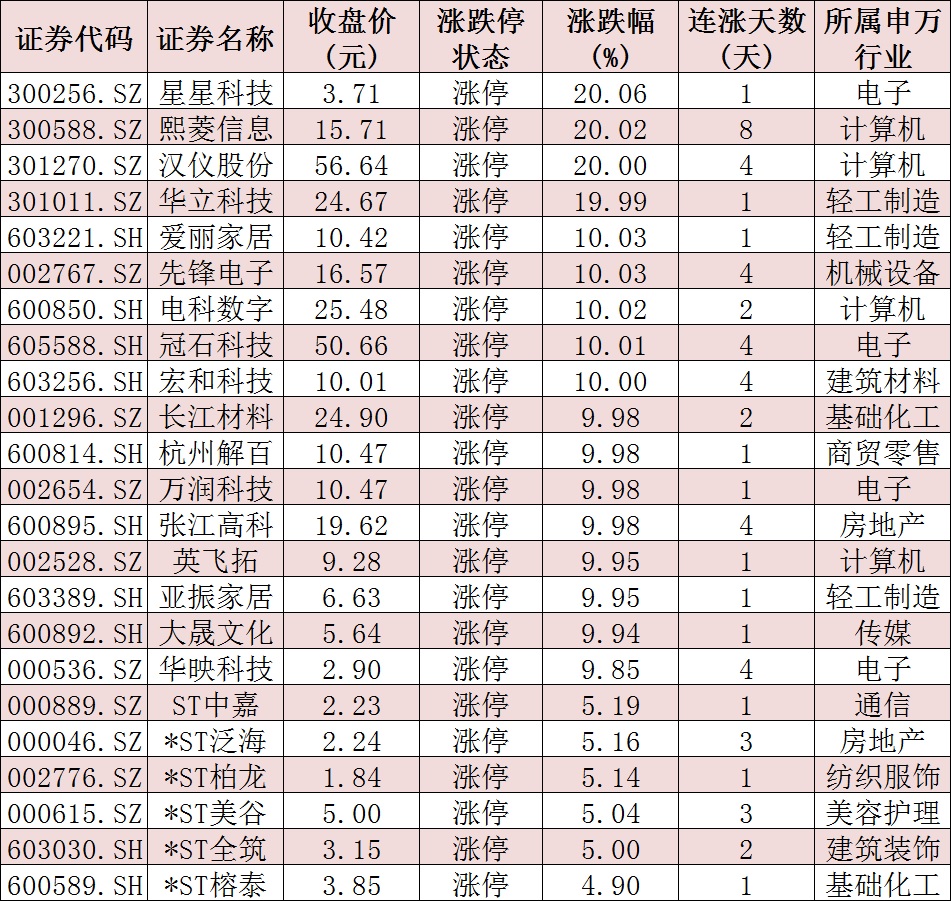 表:今日收盤漲停個股情況: