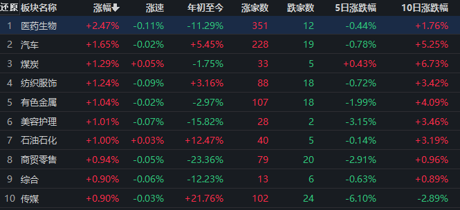 熱點(diǎn)方面,從申萬(wàn)行業(yè)來(lái)看,截至9月11日上午收盤,醫(yī)藥生物領(lǐng)漲,汽車、煤炭、有色金屬等板塊漲幅居前。另外,國(guó)防軍工、房地產(chǎn)、計(jì)算機(jī)等板塊跌幅居前。