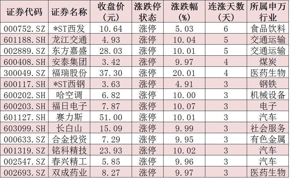 表:連續(xù)上漲3日且今日收盤漲停個(gè)股情況: