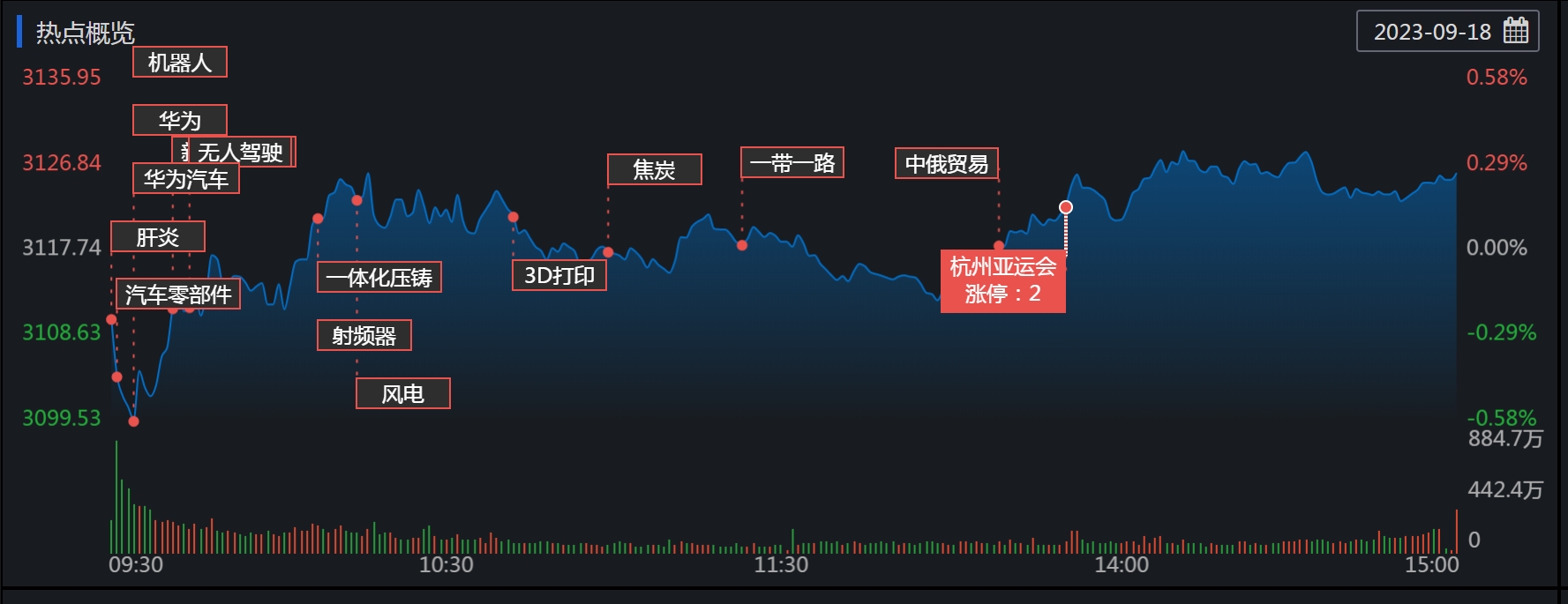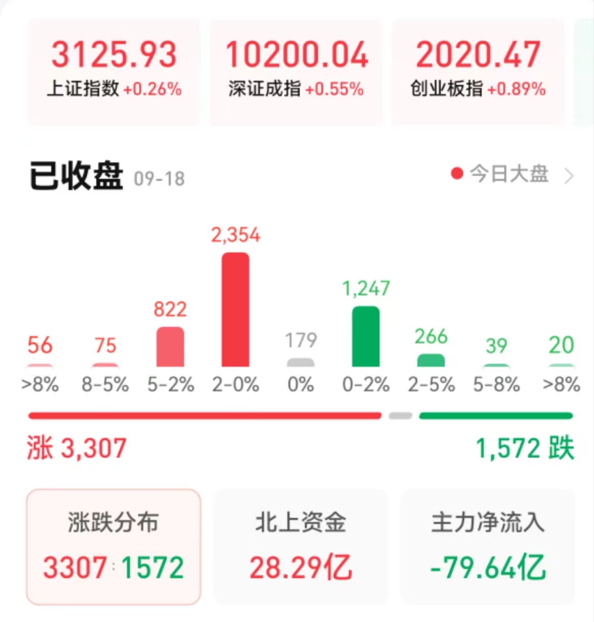 周一(9月18日),A股三大股指震蕩上行,全線飄紅。截至收盤,上證指數(shù)漲0.26%報(bào)3125.93點(diǎn),深證成指漲0.55%報(bào)10200.04點(diǎn),創(chuàng)業(yè)板指漲0.89%報(bào)2020.47點(diǎn);兩市合計(jì)成交金額6985億元,北向資金凈買入額28.29億元。總體上看,兩市個(gè)股漲多跌少。其中,漲停個(gè)股達(dá)53只,跌停個(gè)股達(dá)14只。