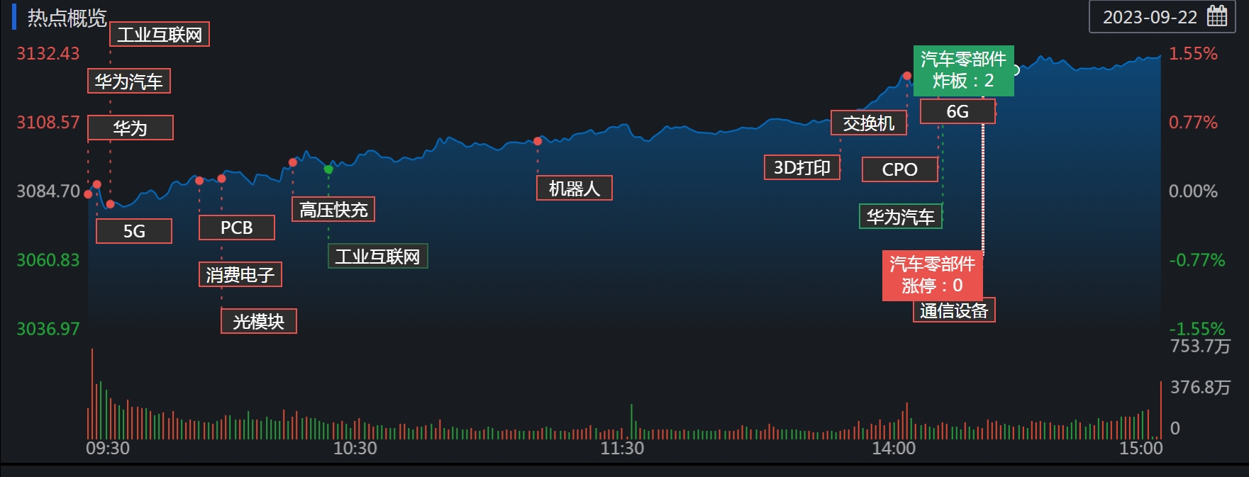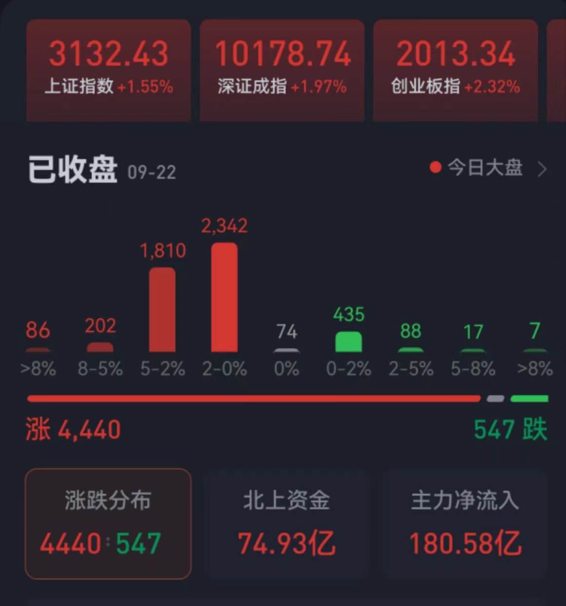 周五(9月22日),A股三大股指震蕩上行,全線飄紅,漲幅均超1%。截至收盤(pán),上證指數(shù)漲1.55%報(bào)3132.43點(diǎn),深證成指漲1.97%報(bào)10178.74點(diǎn),創(chuàng)業(yè)板指漲2.32%報(bào)2013.34點(diǎn),兩市合計(jì)成交金額達(dá)7654.59億元,較前一交易日有所放大,北向資金凈買(mǎi)入額74.93億元??傮w上看,兩市個(gè)股漲多跌少,超4400只個(gè)股實(shí)現(xiàn)上漲,形成普漲格局。其中,漲停個(gè)股達(dá)35只,跌停個(gè)股達(dá)13只。