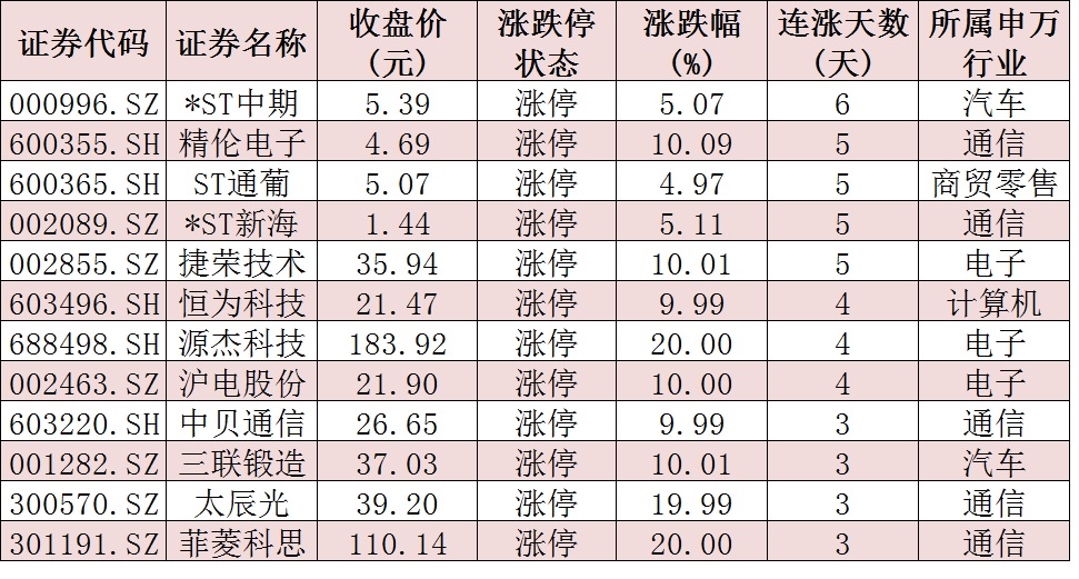 表:連續(xù)上漲3日且今日收盤(pán)漲停個(gè)股情況: