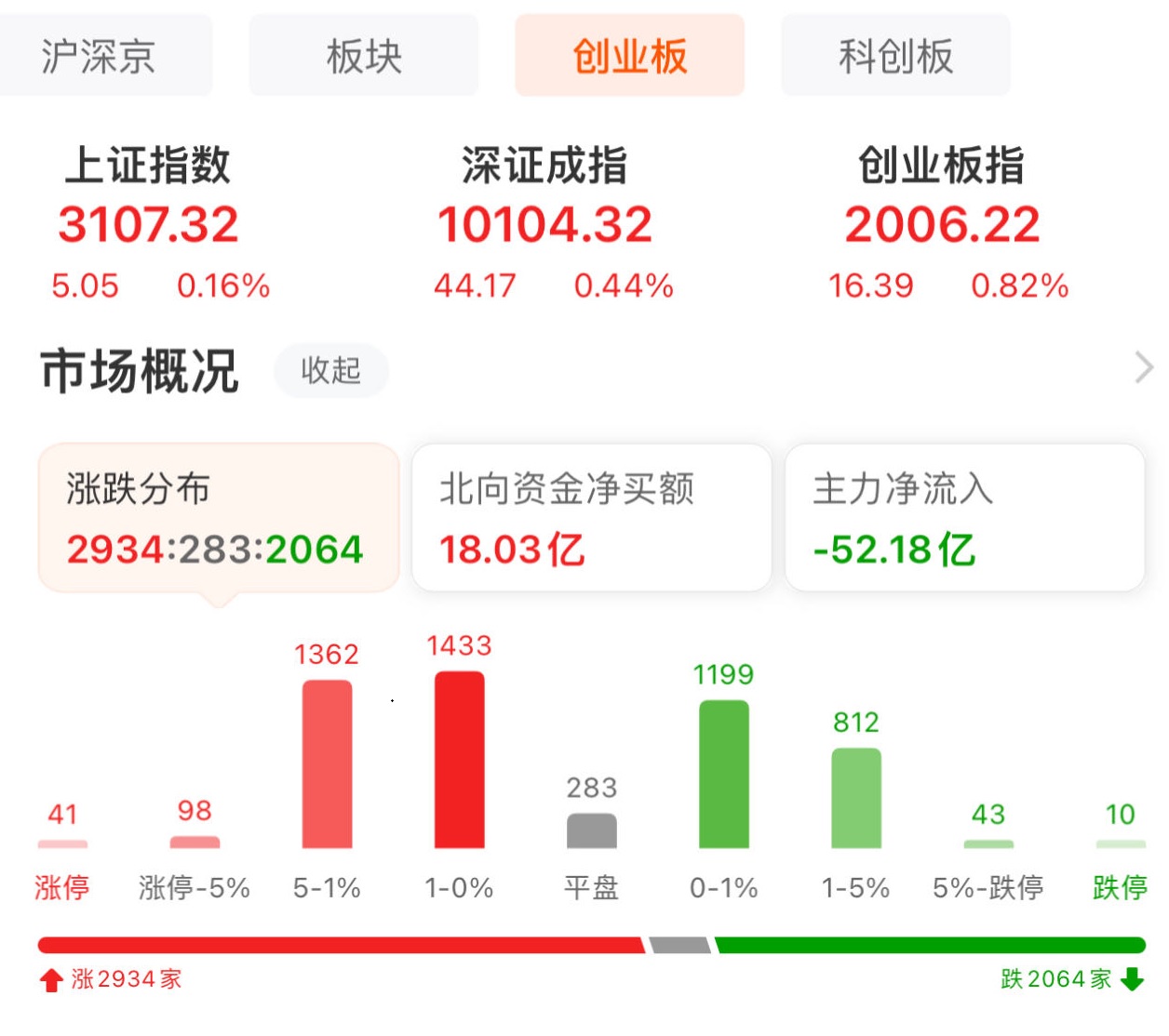 周三(9月27日),A股三大股指集體收漲。截至收盤,上證指數(shù)漲0.16%報3107.32點,深證成指漲0.44%報10104.32點,創(chuàng)業(yè)板指漲0.82%報2006.22點;滬深兩市合計成交金額7165.34億元??傮w上看,A股個股漲多跌少。從漲跌停情況看,漲停個股41只,跌停個股10只。