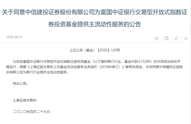 上交所4月27日公告,同意中信建投證券股份有限公司為富國(guó)中證銀行交易型開放式指數(shù)證券投資基金(簡(jiǎn)稱:銀行行業(yè),基金代碼:515280)提供主流動(dòng)性服務(wù)。