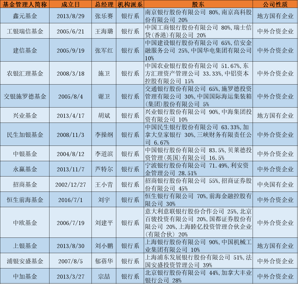 另外,股份制銀行系基金公司共有4家,分別為浦銀安盛基金、招商基金、民生加銀基金、興業(yè)基金;城商行系基金公司共有4家分別為中加基金、上銀基金、鑫元基金、永贏基金。此外,還有意大利意聯(lián)銀行、恒生銀行持股的中歐基金、恒生前?;穑@些銀行系基金公司在近幾年成長(zhǎng)速度迅猛,業(yè)績(jī)可圈可點(diǎn)。