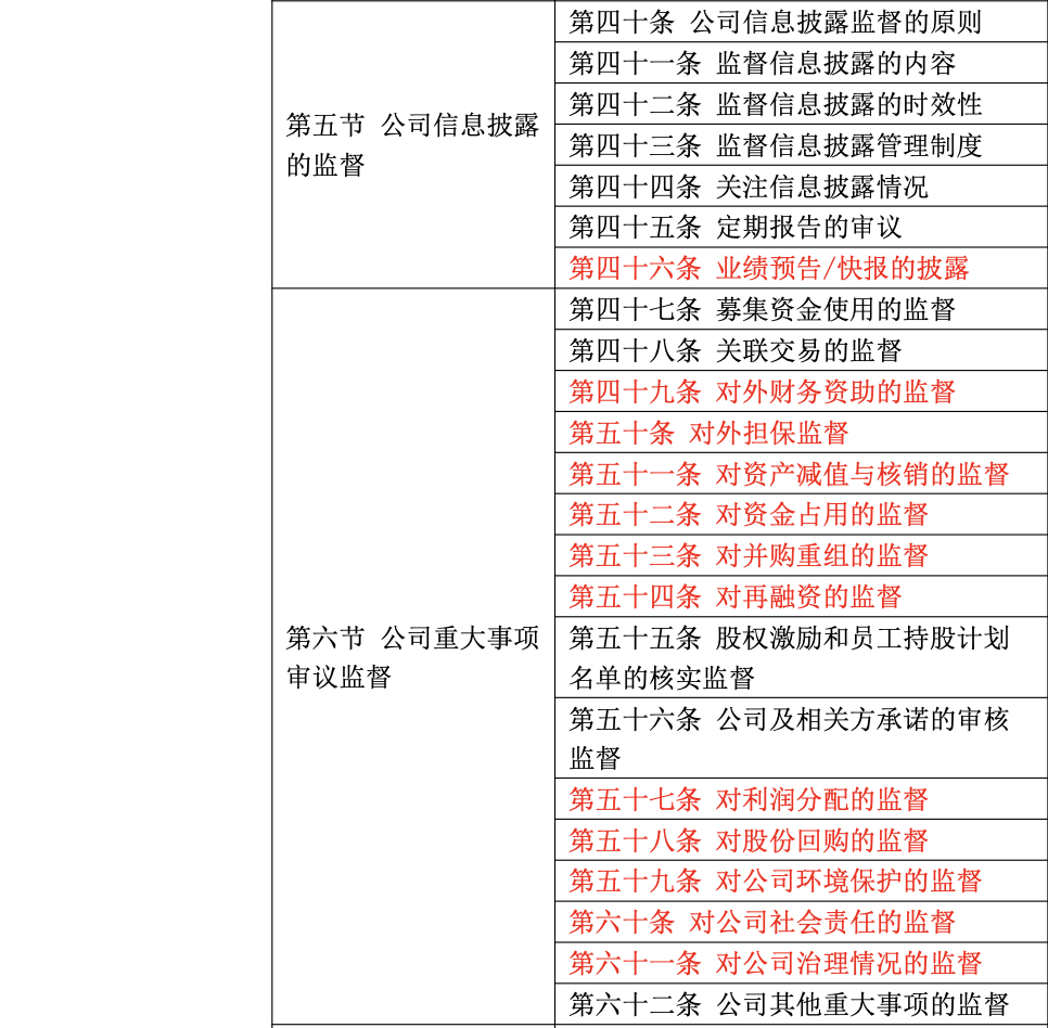 在增加監(jiān)管關(guān)注要點(diǎn)方面,根據(jù)近年來監(jiān)管關(guān)注要點(diǎn),《指引》增加相應(yīng)條目,如對財務(wù)會計報告的監(jiān)督;業(yè)績預(yù)告/快報的披露監(jiān)督;對外財務(wù)資助、對外擔(dān)保、資產(chǎn)減值與核銷、資金占用、并購重組、再融資、利潤分配、股份回購、公司環(huán)境保護(hù)、公司社會責(zé)任和公司治理情況的監(jiān)督等。