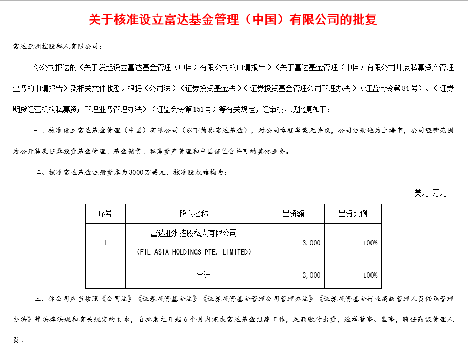 批復(fù)文件顯示,富達(dá)基金注冊(cè)資本為3000萬(wàn)美元,富達(dá)亞洲控股私人有限公司100%持股,公司注冊(cè)地為上海市,公司經(jīng)營(yíng)范圍為公開(kāi)募集證券投資基金管理、基金銷售、私募資產(chǎn)管理和中國(guó)證監(jiān)會(huì)許可的其他業(yè)務(wù)。