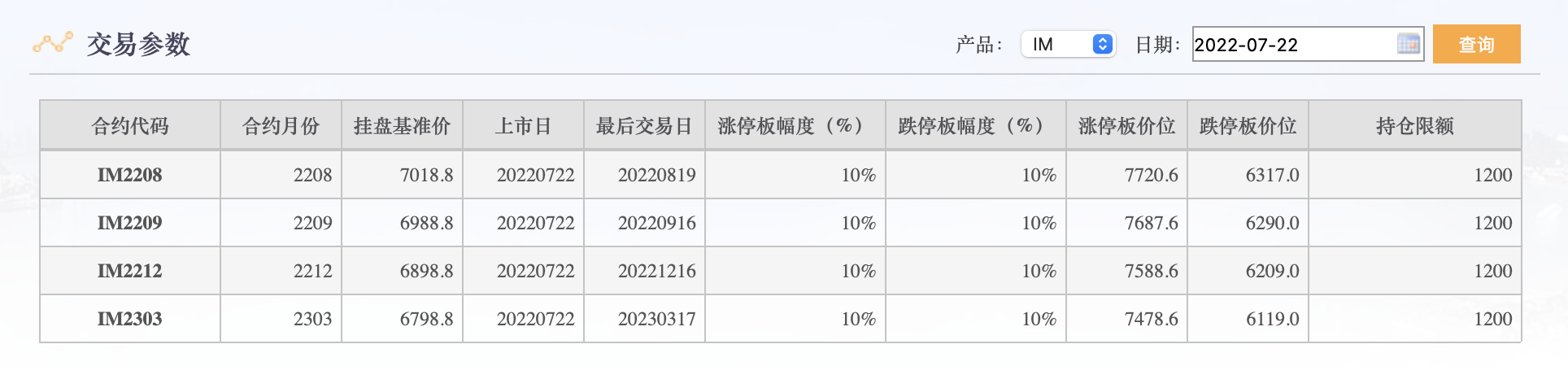7月21日,中金所發(fā)布《關(guān)于中證1000股指期貨和股指期權(quán)首批上市合約掛盤基準價的通知》。7月22日,中證1000股指期貨IM2208合約、IM2209合約、IM2212合約和IM2303合約上市,掛盤基準價分別為7018.8點、6988.8點、6898.8點和6798.8點。