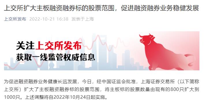 其中,滬市主板標(biāo)的股票數(shù)量由現(xiàn)有的800只擴大到1000只,深市注冊制股票以外的標(biāo)的股票數(shù)量由現(xiàn)有的800只擴大到1200只,上述調(diào)整將自2022年10月24日起實施。