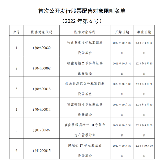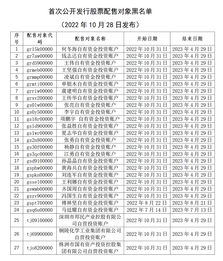 本報(bào)訊 10月28日,中證協(xié)發(fā)布《首次公開發(fā)行股票配售對象限制名單公告(2022年第6號)》和《首次公開發(fā)行股票配售對象黑名單公告(2022年第8號)》。