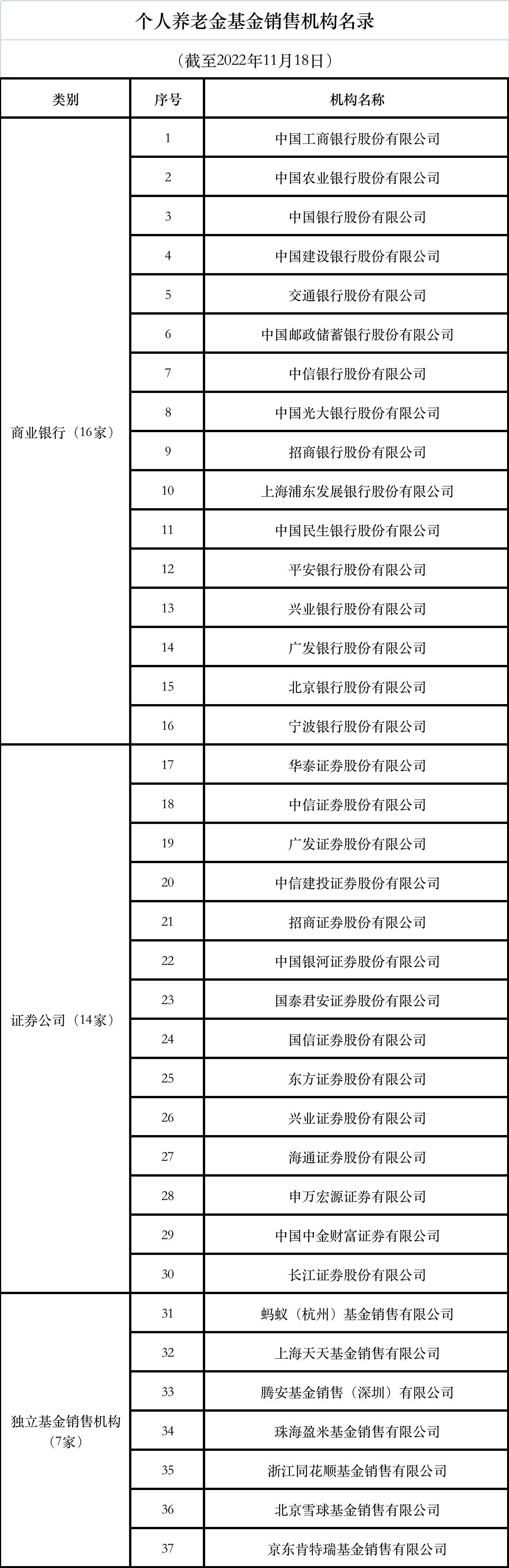 11月18日,證監(jiān)會發(fā)布個人養(yǎng)老金基金名錄和個人養(yǎng)老金基金銷售機構(gòu)名錄。個人養(yǎng)老金基金包含129只養(yǎng)老目標基金,個人養(yǎng)老金基金銷售機構(gòu)共37家。