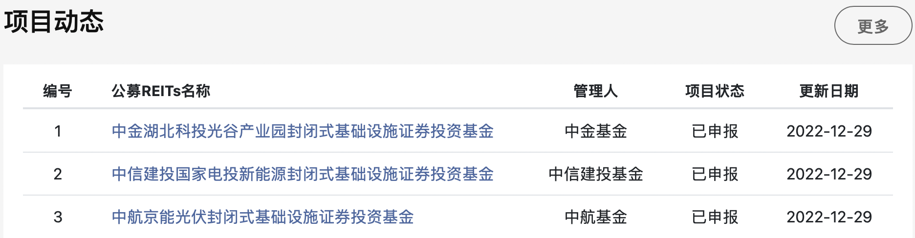 這3單公募REITs分別為中信建投國家電投新能源封閉式基礎(chǔ)設(shè)施證券投資基金、中航京能光伏封閉式基礎(chǔ)設(shè)施證券投資基金、中金湖北科投光谷產(chǎn)業(yè)園封閉式基礎(chǔ)設(shè)施證券投資基金,目前項目狀態(tài)為“已申報”。