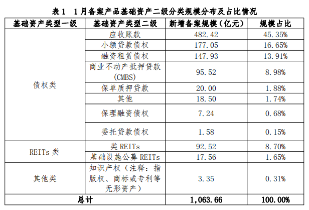 按基礎(chǔ)資產(chǎn)一級(jí)分類,1月份債權(quán)類產(chǎn)品新增備案規(guī)模950.24億元;REITs類產(chǎn)品新增備案規(guī)模110.08億元;其他類產(chǎn)品新增備案規(guī)模3.35億元。按基礎(chǔ)資產(chǎn)二級(jí)分類,小額貸款債權(quán)、應(yīng)收賬款、融資租賃債權(quán)、商業(yè)不動(dòng)產(chǎn)抵押貸款(CMBS)新增備案規(guī)模合計(jì)占月度備案產(chǎn)品新增備案規(guī)模的84.89%,較上月增長(zhǎng)18.17%。