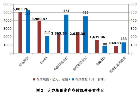 截至2023年1月底,存續(xù)企業(yè)資產(chǎn)證券化產(chǎn)品2206只,存續(xù)規(guī)模19540.34億元,存續(xù)規(guī)模較上月增長(zhǎng)0.31%。按基礎(chǔ)資產(chǎn)二級(jí)分類來(lái)看,應(yīng)收賬款、商業(yè)不動(dòng)產(chǎn)抵押貸款(CMBS)、小額貸款債權(quán)、融資租賃債權(quán)、類REITs以及基礎(chǔ)設(shè)施類收費(fèi)存續(xù)規(guī)模合計(jì)16503.08億元,占總存續(xù)規(guī)模的84.46%。基礎(chǔ)設(shè)施公募REITs、保障房、購(gòu)房尾款等其他類別基礎(chǔ)資產(chǎn)存續(xù)規(guī)模合計(jì)3037.26億元,占總存續(xù)規(guī)模的15.54%。