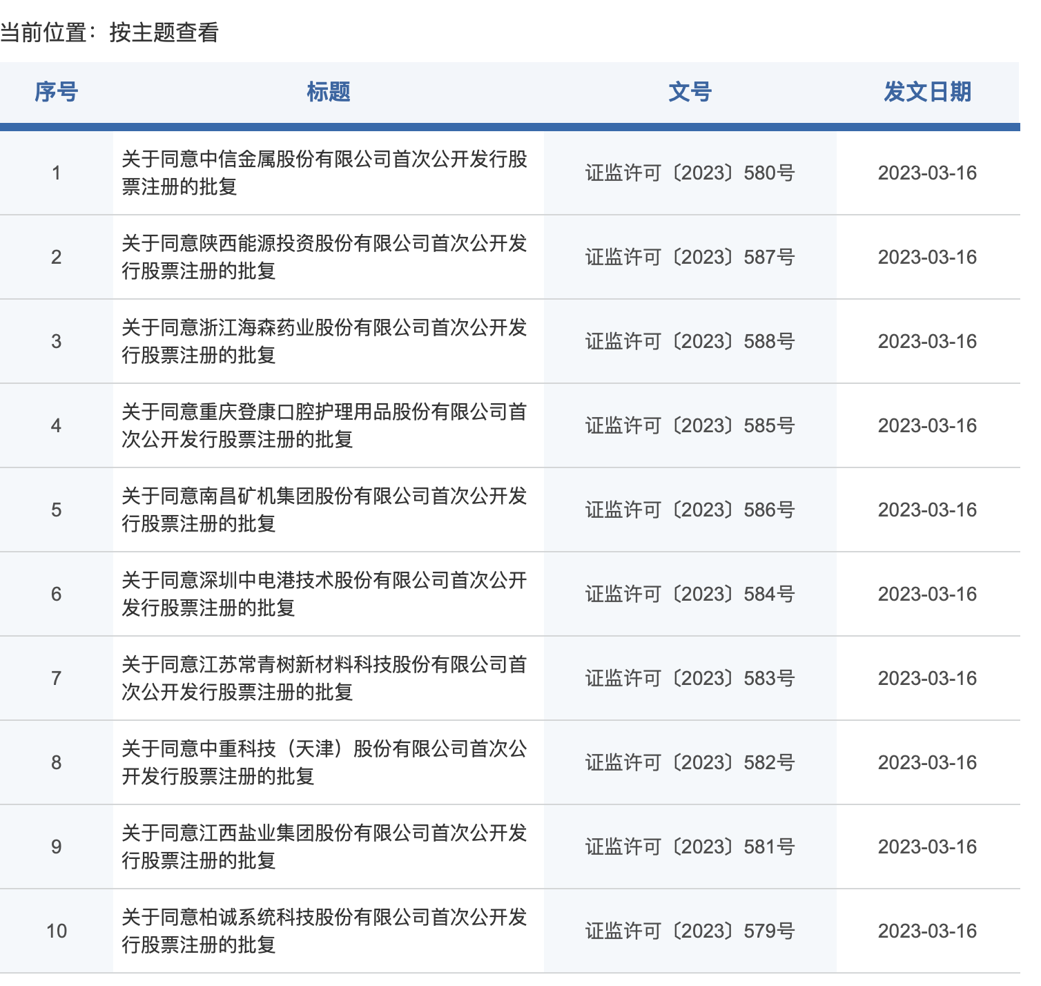 全面注冊制下首批主板IPO注冊生效企業(yè)出爐!3月16日,證監(jiān)會(huì)同意10家主板企業(yè)IPO注冊,滬深主板分別為5家,包括中信金屬、江鹽股份、常青科技、中重科技、柏誠股份、中電港、陜能股份、海森藥業(yè)、登康口腔、南礦集團(tuán),共10家企業(yè)。