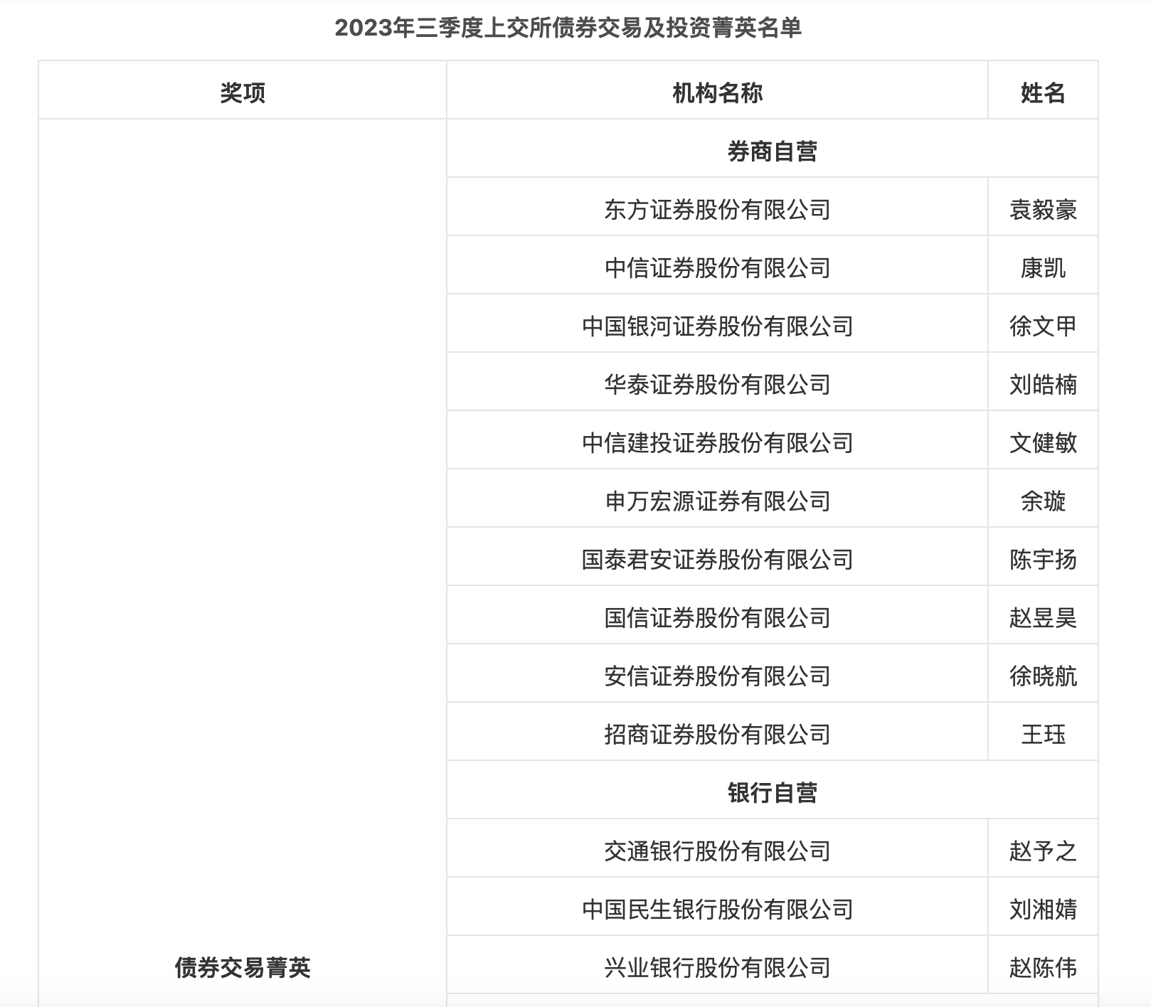 為鼓勵市場機構(gòu)積極參與債券投資交易、做市業(yè)務(wù)及創(chuàng)新業(yè)務(wù),推動交易所債券買方市場建設(shè),2023年第三季度,上交所持續(xù)開展債券交易及投資菁英排名活動,共評選出16類獎項。