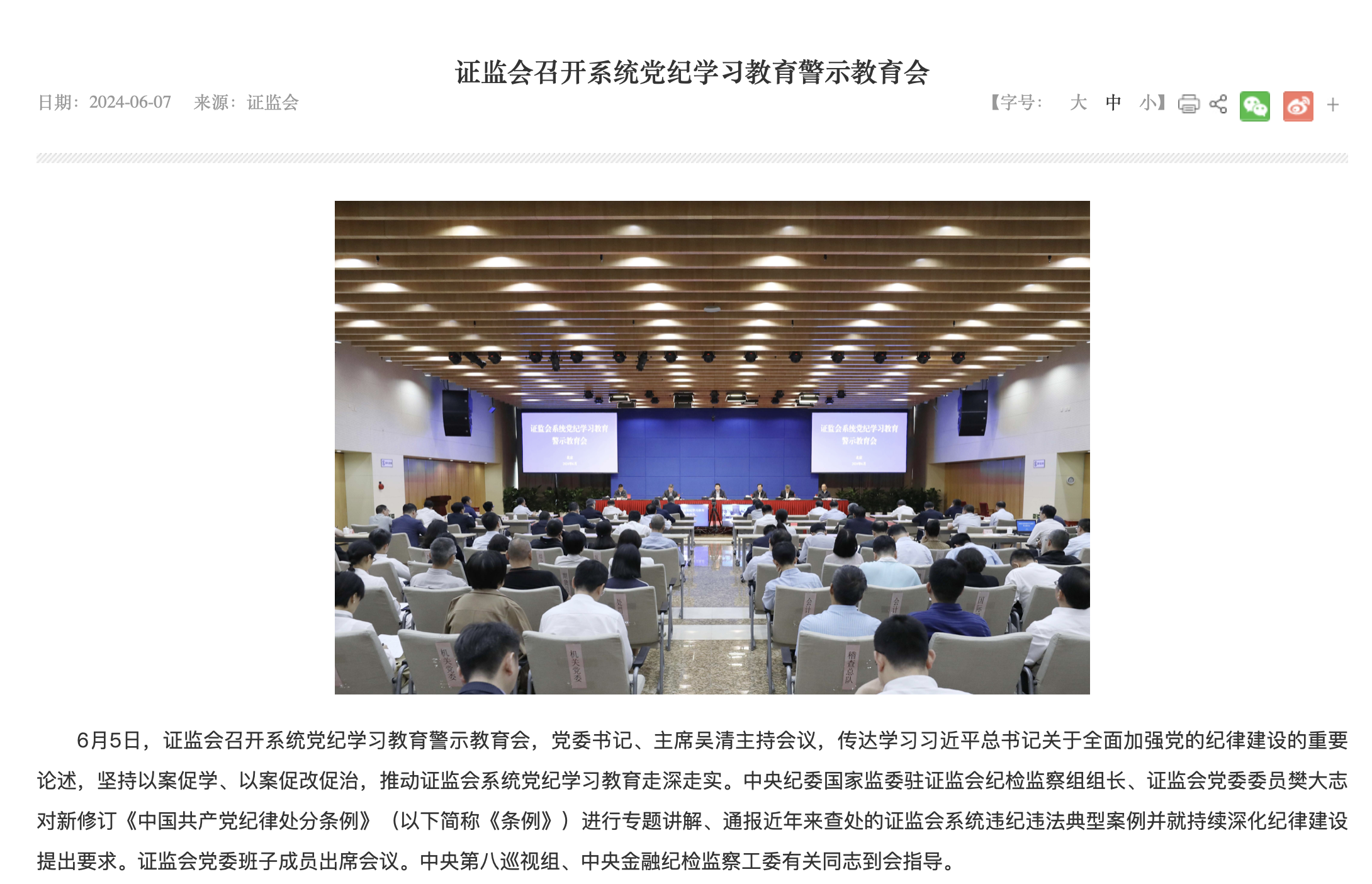 據(jù)證監(jiān)會網(wǎng)站6月7日消息,證監(jiān)會于6月5日召開系統(tǒng)黨紀(jì)學(xué)習(xí)教育警示教育會,證監(jiān)會黨委書記、主席吳清主持會議,傳達(dá)學(xué)習(xí)習(xí)近平總書記關(guān)于全面加強(qiáng)黨的紀(jì)律建設(shè)的重要論述,堅(jiān)持以案促學(xué)、以案促改促治,推動證監(jiān)會系統(tǒng)黨紀(jì)學(xué)習(xí)教育走深走實(shí)。