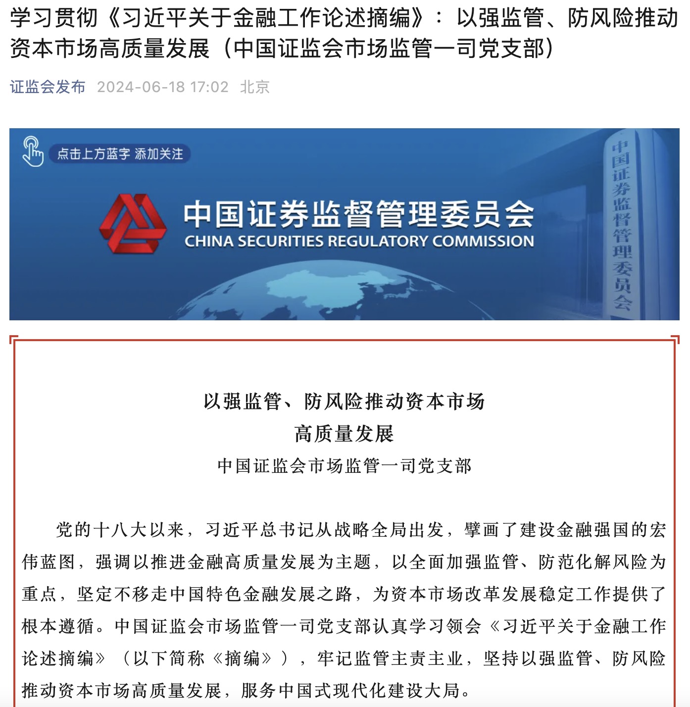 中國證監(jiān)會市場監(jiān)管一司黨支部認(rèn)真學(xué)習(xí)領(lǐng)會《習(xí)近平關(guān)于金融工作論述摘編》(以下簡稱《摘編》),牢記監(jiān)管主責(zé)主業(yè),堅(jiān)持以強(qiáng)監(jiān)管、防風(fēng)險(xiǎn)推動資本市場高質(zhì)量發(fā)展,服務(wù)中國式現(xiàn)代化建設(shè)大局。