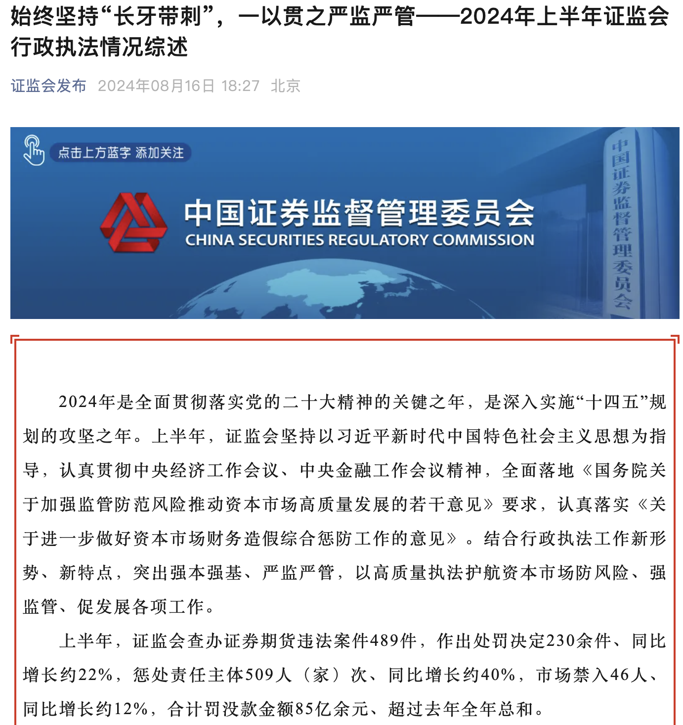 8月16日,證監(jiān)會(huì)發(fā)布2024年上半年行政執(zhí)法情況綜述。上半年,證監(jiān)會(huì)查辦證券期貨違法案件489件,作出處罰決定230余件、同比增長(zhǎng)約22%,懲處責(zé)任主體509人(家)次、同比增長(zhǎng)約40%,市場(chǎng)禁入46人、同比增長(zhǎng)約12%,合計(jì)罰沒(méi)款金額85億余元、超過(guò)去年全年總和。