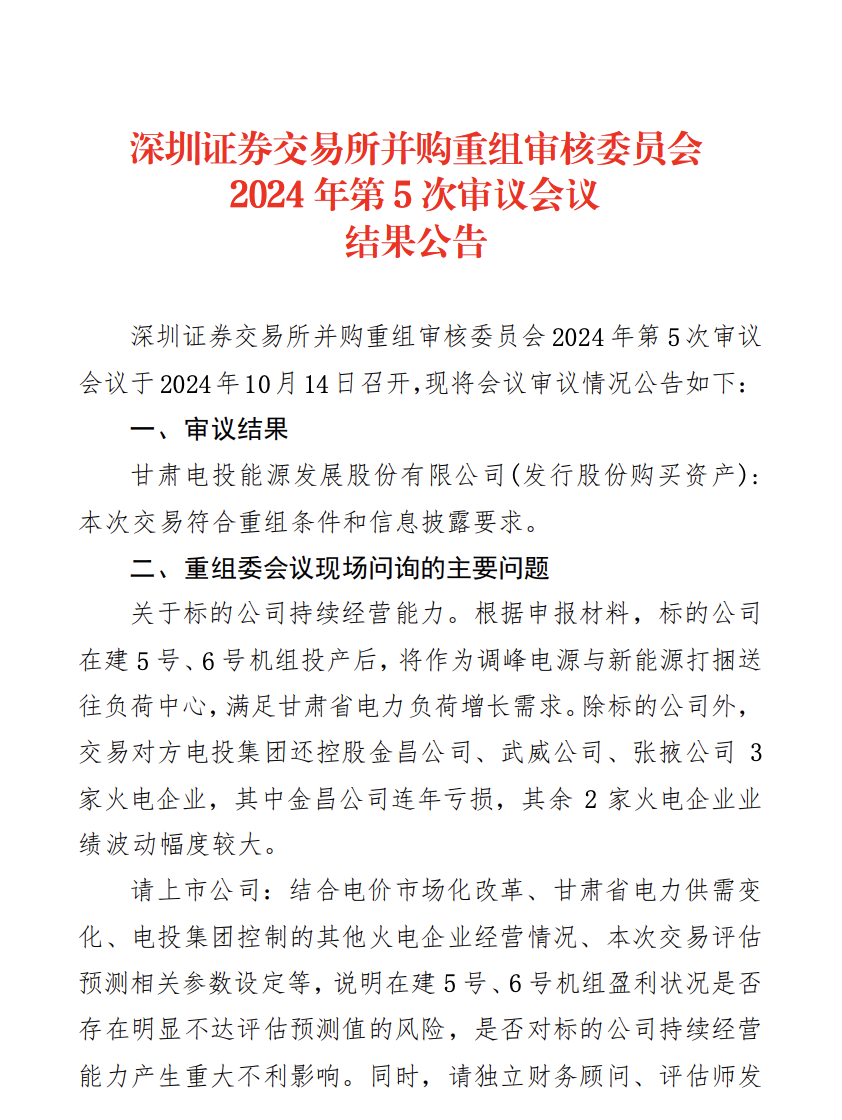深交所并購重組審核委員會10月14日召開的2024年第5次審議會議結果公告顯示,甘肅能源發(fā)行股份購買資產(chǎn)交易符合重組條件和信息披露要求。從并購重組審核委員會現(xiàn)場問詢的主要問題來看,主要集中在標的公司持續(xù)經(jīng)營能力方面。