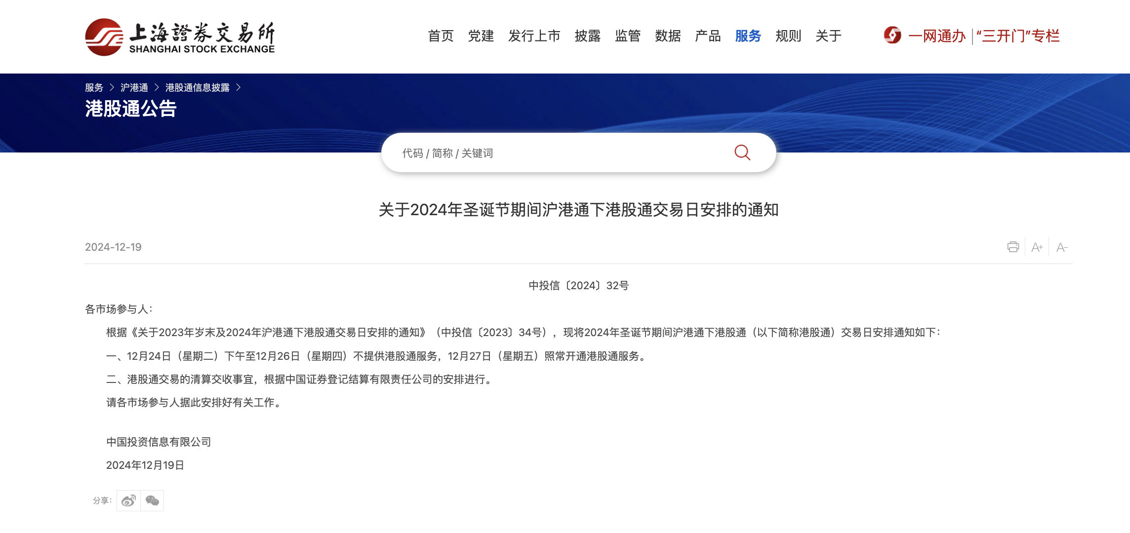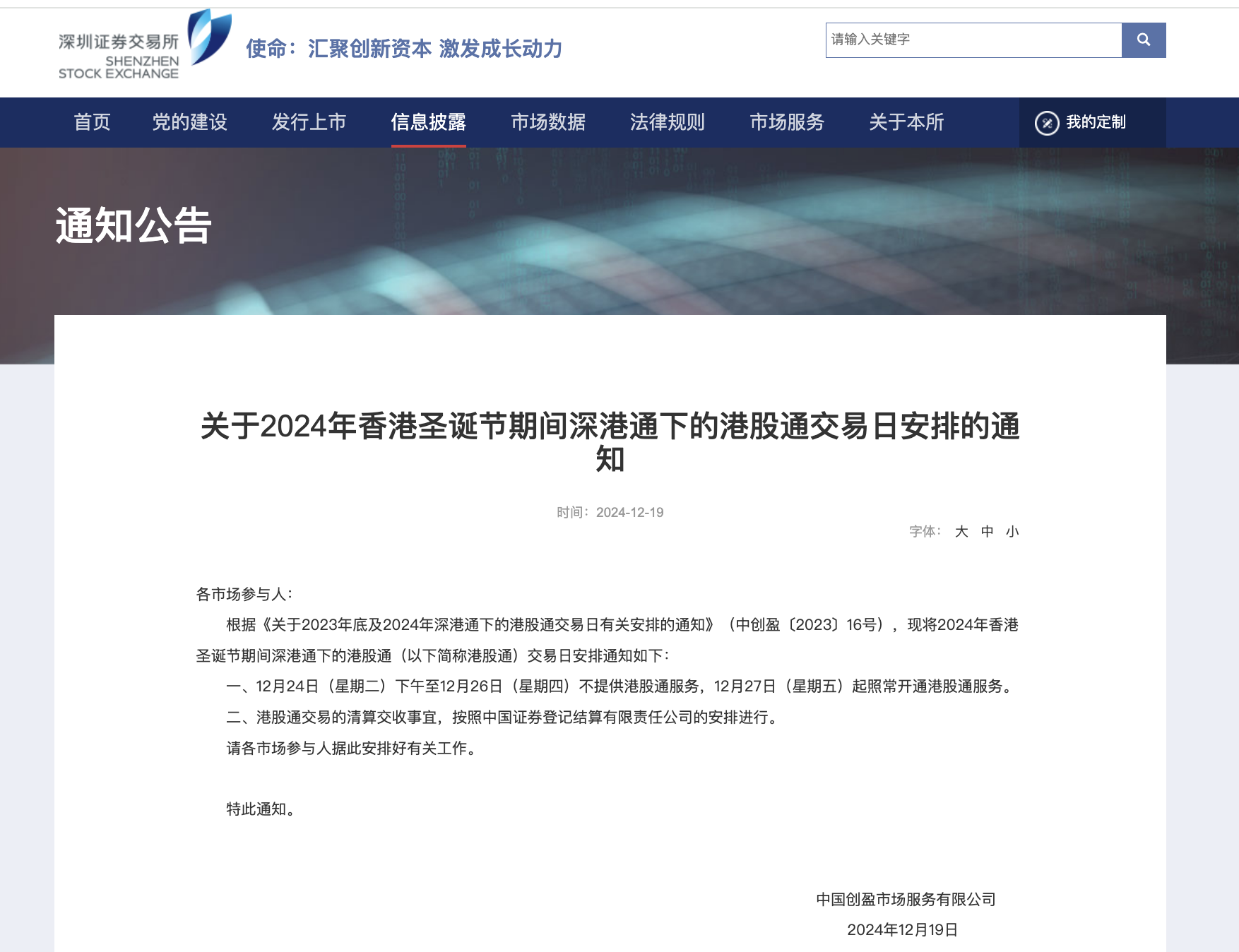 根據(jù)通知,2024年12月24日(星期二)下午至12月26日(星期四)不提供港股通服務(wù),12月27日(星期五)照常開通港股通服務(wù)。