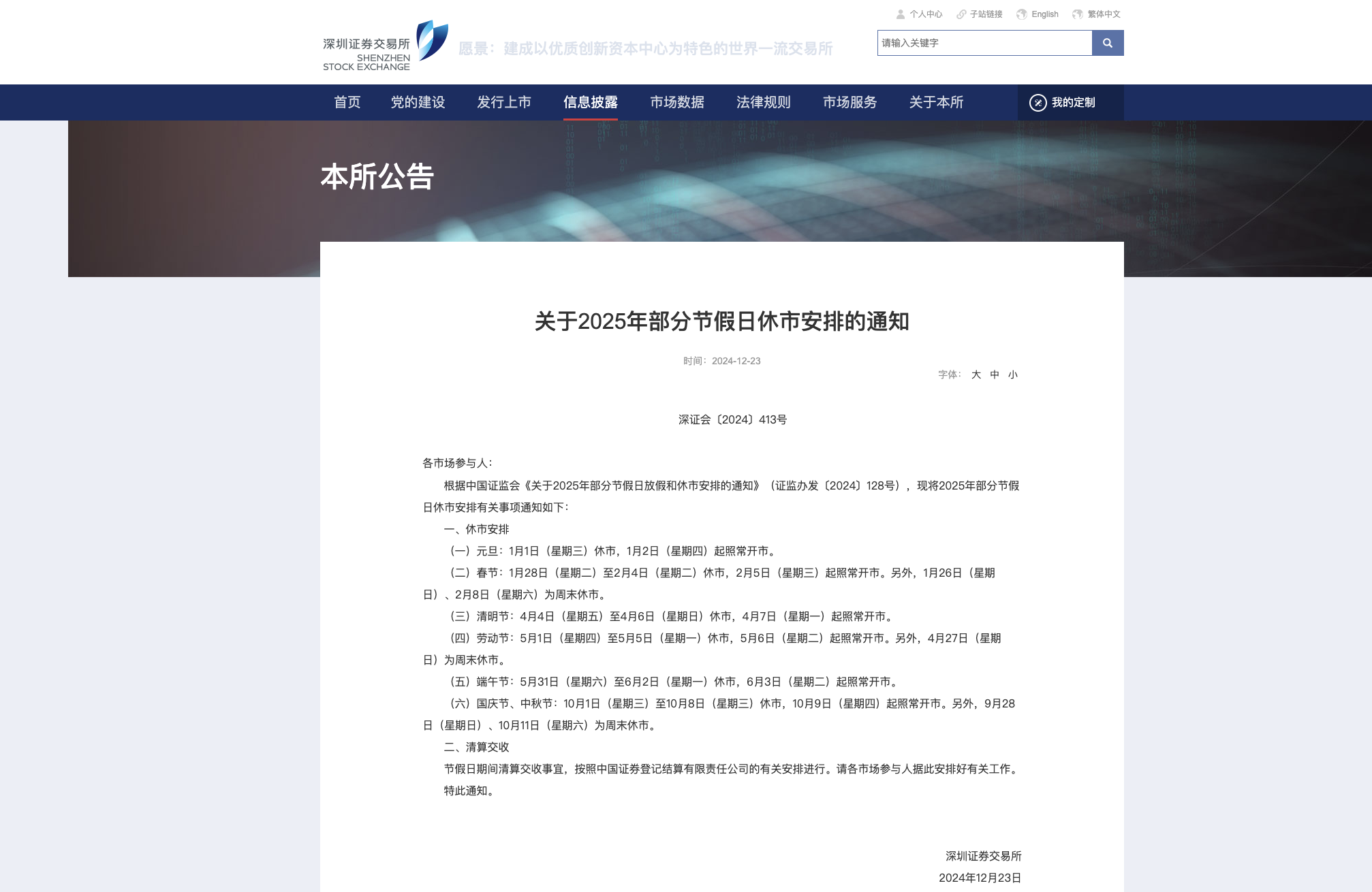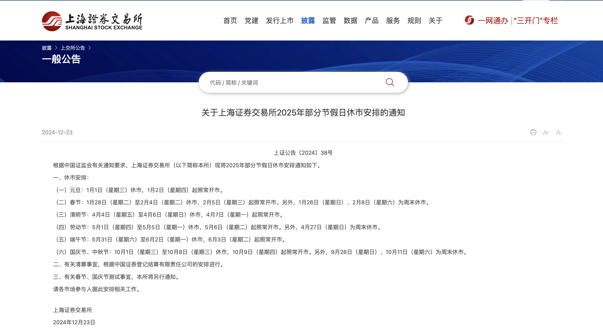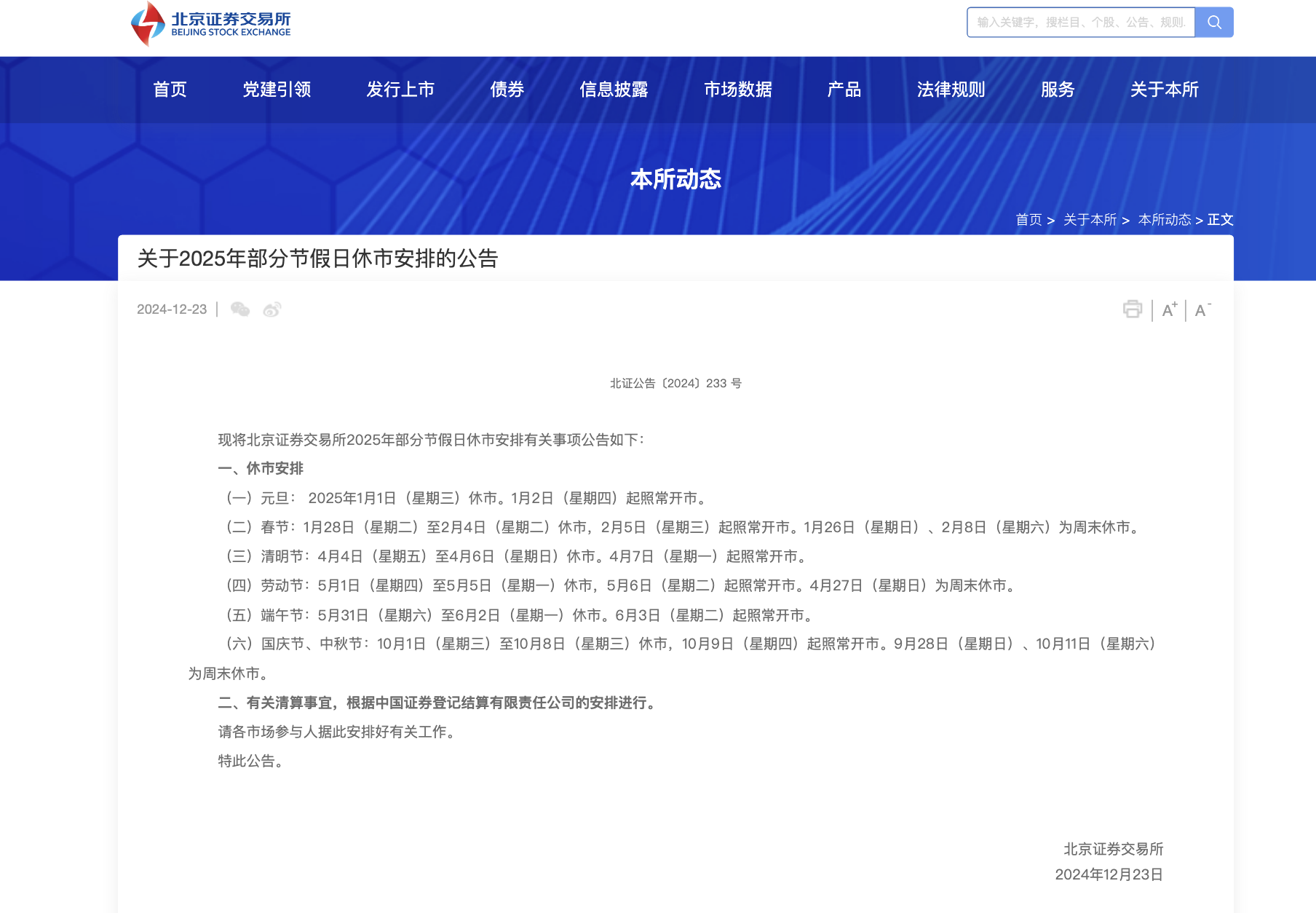 12月23日,滬深北交易所官網(wǎng)發(fā)布關(guān)于2025年部分節(jié)假日休市安排的通知。