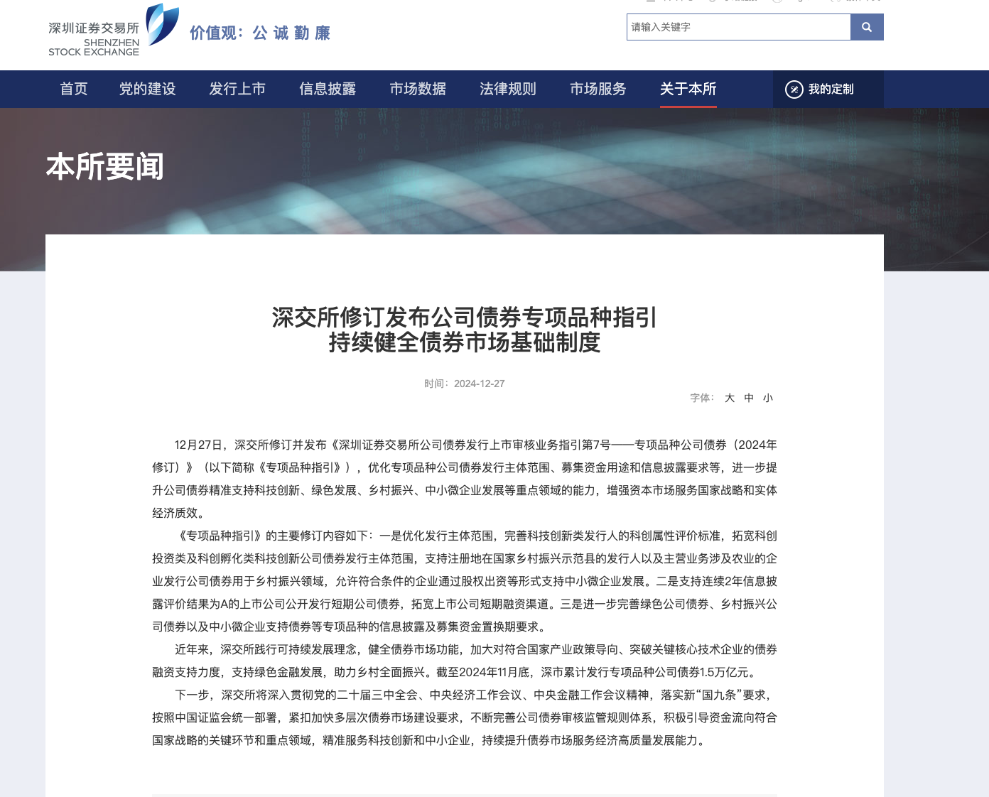 12月27日,滬深交易所修訂發(fā)布公司債券專項品種指引,持續(xù)健全債券市場基礎(chǔ)制度,提升服務(wù)國家戰(zhàn)略質(zhì)效。