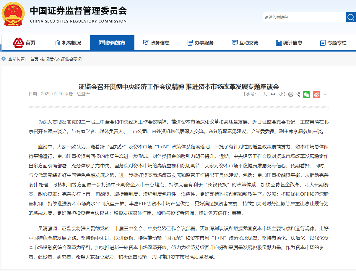 據(jù)證監(jiān)會網(wǎng)站1月10日消息,為深入貫徹落實(shí)黨的二十屆三中全會和中央經(jīng)濟(jì)工作會議精神、推進(jìn)資本市場深化改革和高質(zhì)量發(fā)展,近日證監(jiān)會黨委書記、主席吳清在北京召開專題座談會,與專家學(xué)者、媒體負(fù)責(zé)人、上市公司、內(nèi)外資機(jī)構(gòu)代表深入交流,充分聽取意見建議。證監(jiān)會黨委委員、副主席李超參加座談。